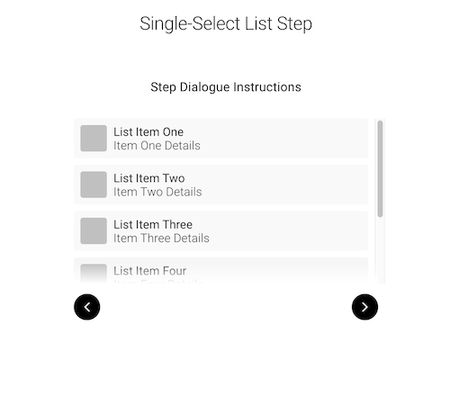 There are two primary step layouts for both selectable types, including the cards and list layouts. See Layout Docs